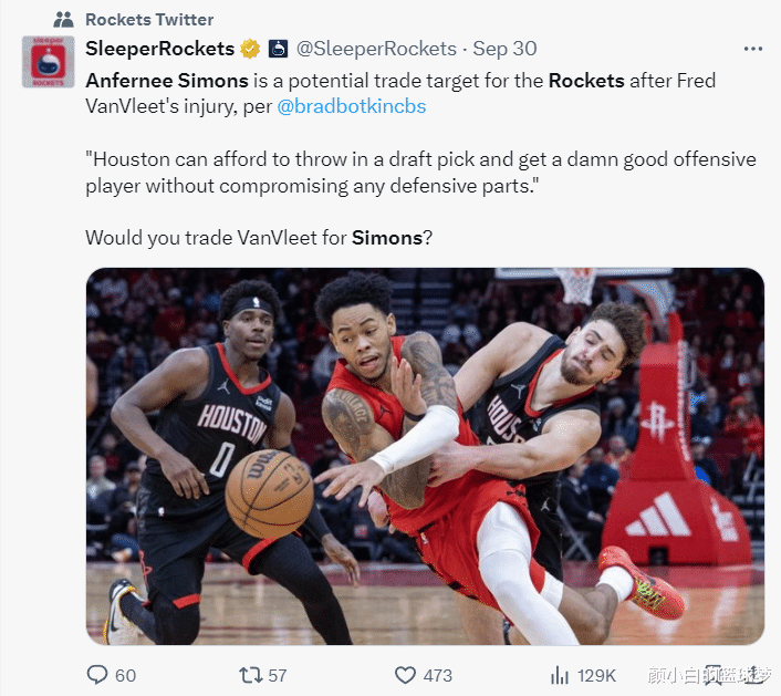 实际上早在9月30日,休媒Sleeper Rockets就透露,在弗雷德-范弗利特赛季报销后,安芬尼-西蒙斯可能成为火箭的引援目标。火箭队完全可以拿出一个选秀权引进一位进攻组织类型的后卫,他的到来也不会影响到火箭防守端的配置,你们愿意用范弗利特交易西蒙斯吗?