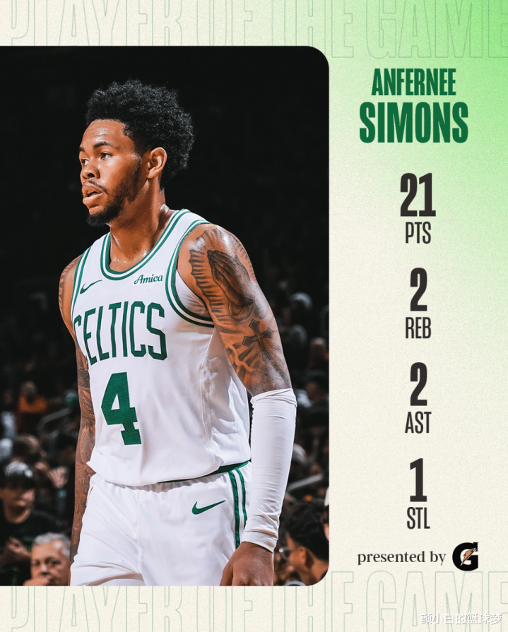 安芬尼-西蒙斯迎来了凯尔特人队的主场季前赛首秀,这场比赛西蒙斯是以替补的身份出战,25分钟,12中6,三分9中6,拿到21分2篮板2助攻1抢断,三分命中率66.7%,这份答卷绝对可以让凯尔特人球迷们满意。